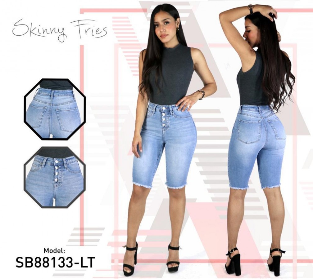Bermuda Skinni Fries de mezclilla de moda.