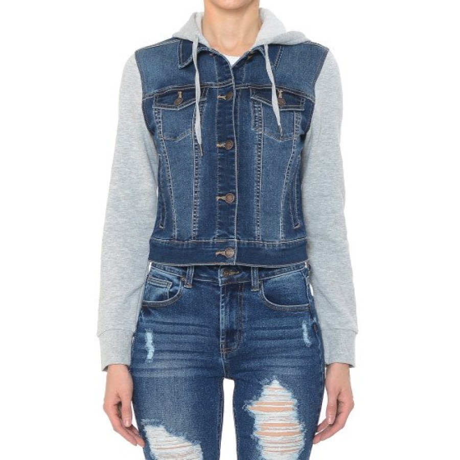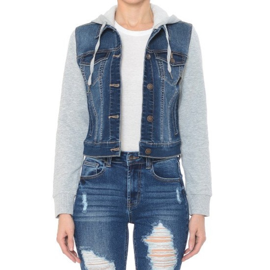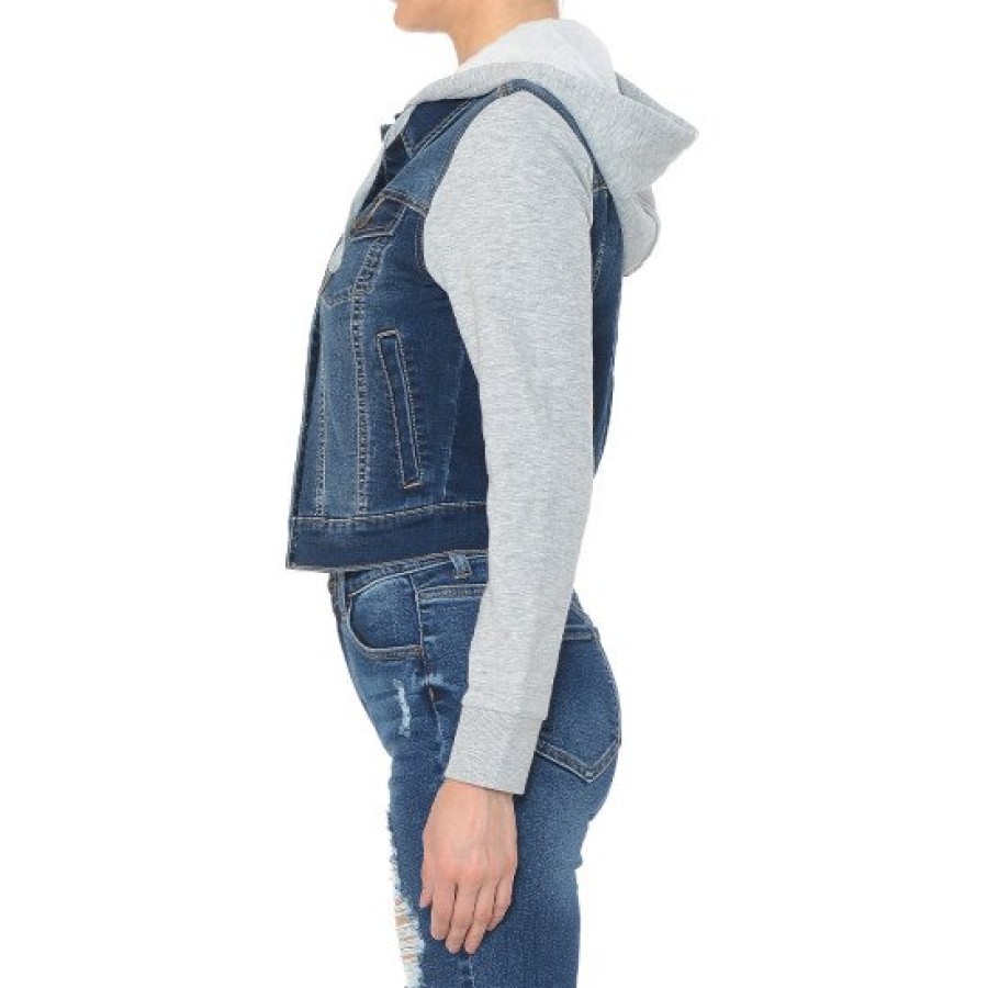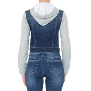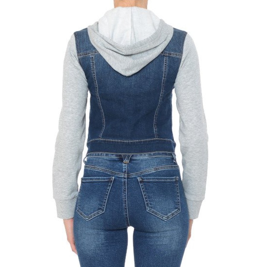 Chamarra de mezclilla tipo chaleco con gorro y mangas de sudadera.